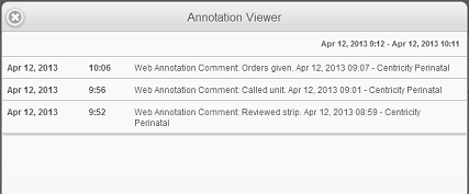 Annotations are available for the time you have loaded for your patient. You can view the web annotation comments, connect annotation comments, and other annotations. Annotations must exist on the CPN fetal strip or Connect time continuum to be seen in the Web Annotation Viewer. Web Annotation Comments can only be viewed in a patient’s details between the time the first grid started and the time the final grid ended. These comments and annotations must be configured items in order to be viewed. Annotations corrected (struck through) in Centricity Perinatal - Connect will not be displayed.